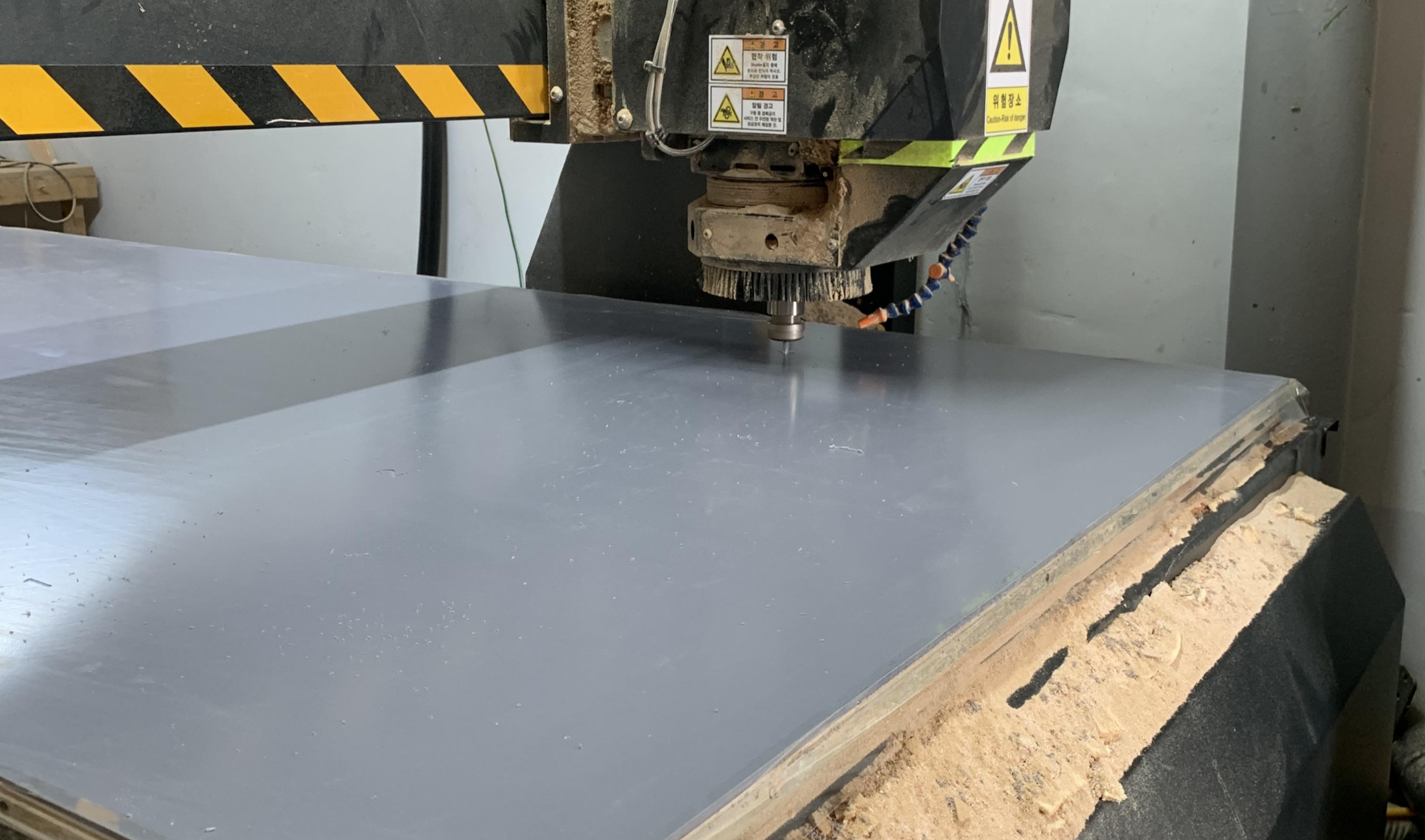 PVC 판넬 1200*2400 사이즈의 큰 사이즈를 사용하여 cnc 가공을 한 모습입니다.
