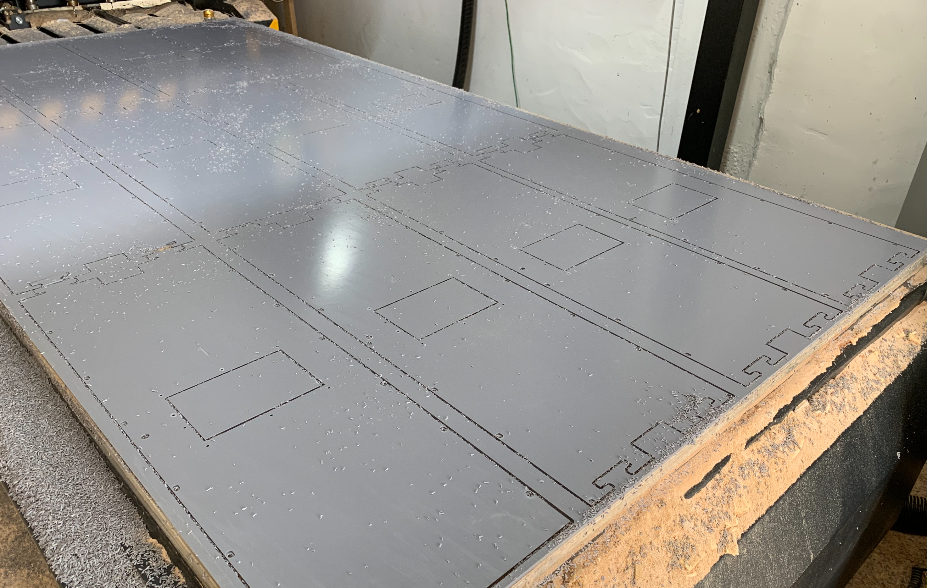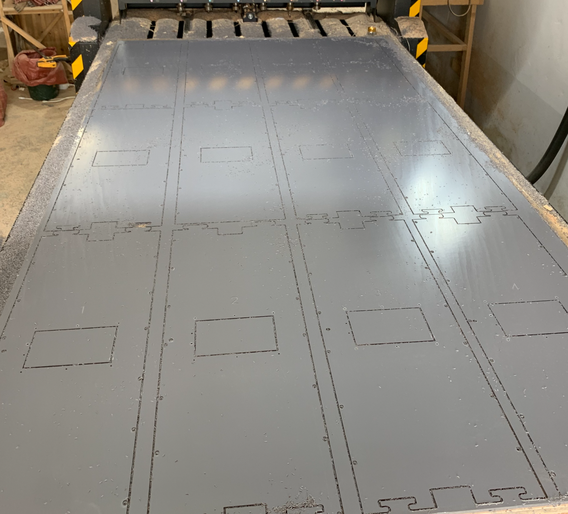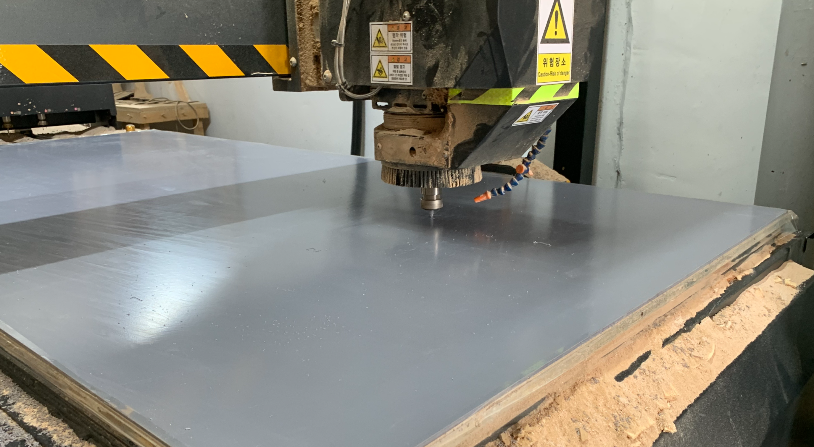 PVC 판넬 1200*2400 사이즈의 큰 사이즈를 사용하여 cnc 가공을 한 모습입니다.