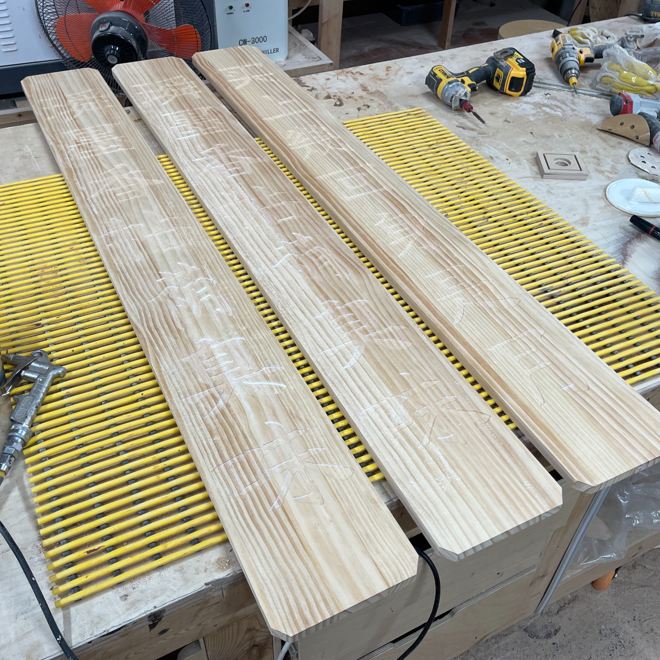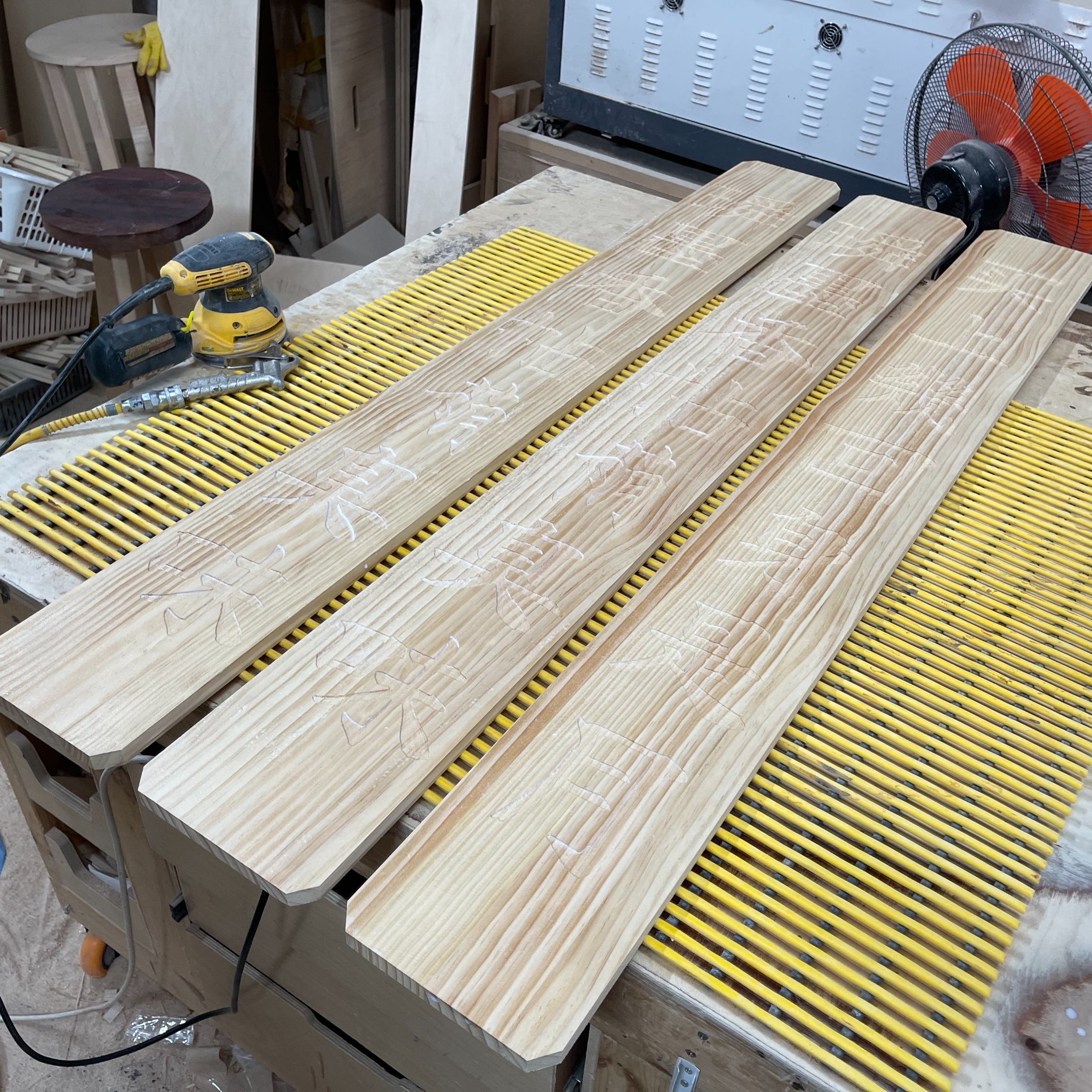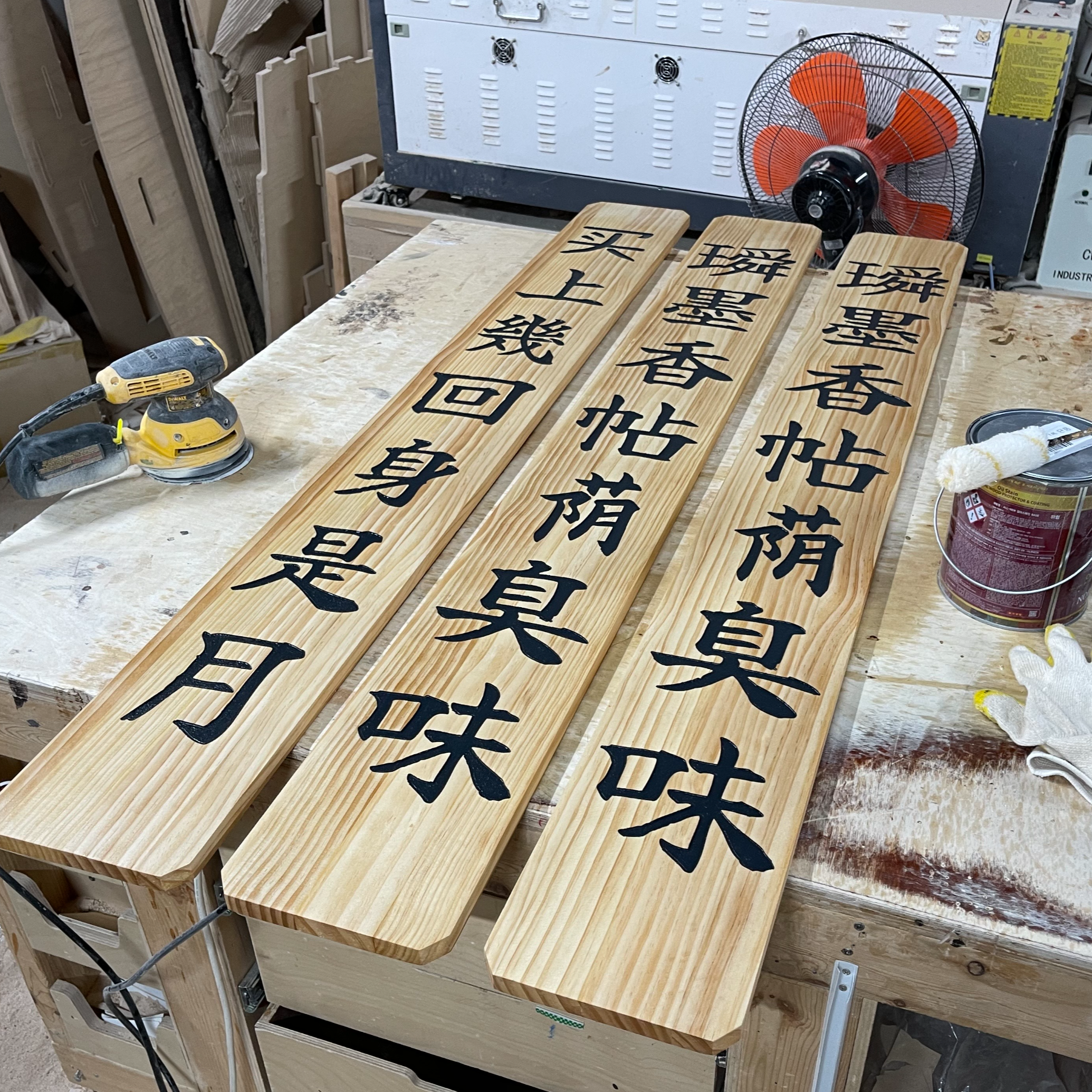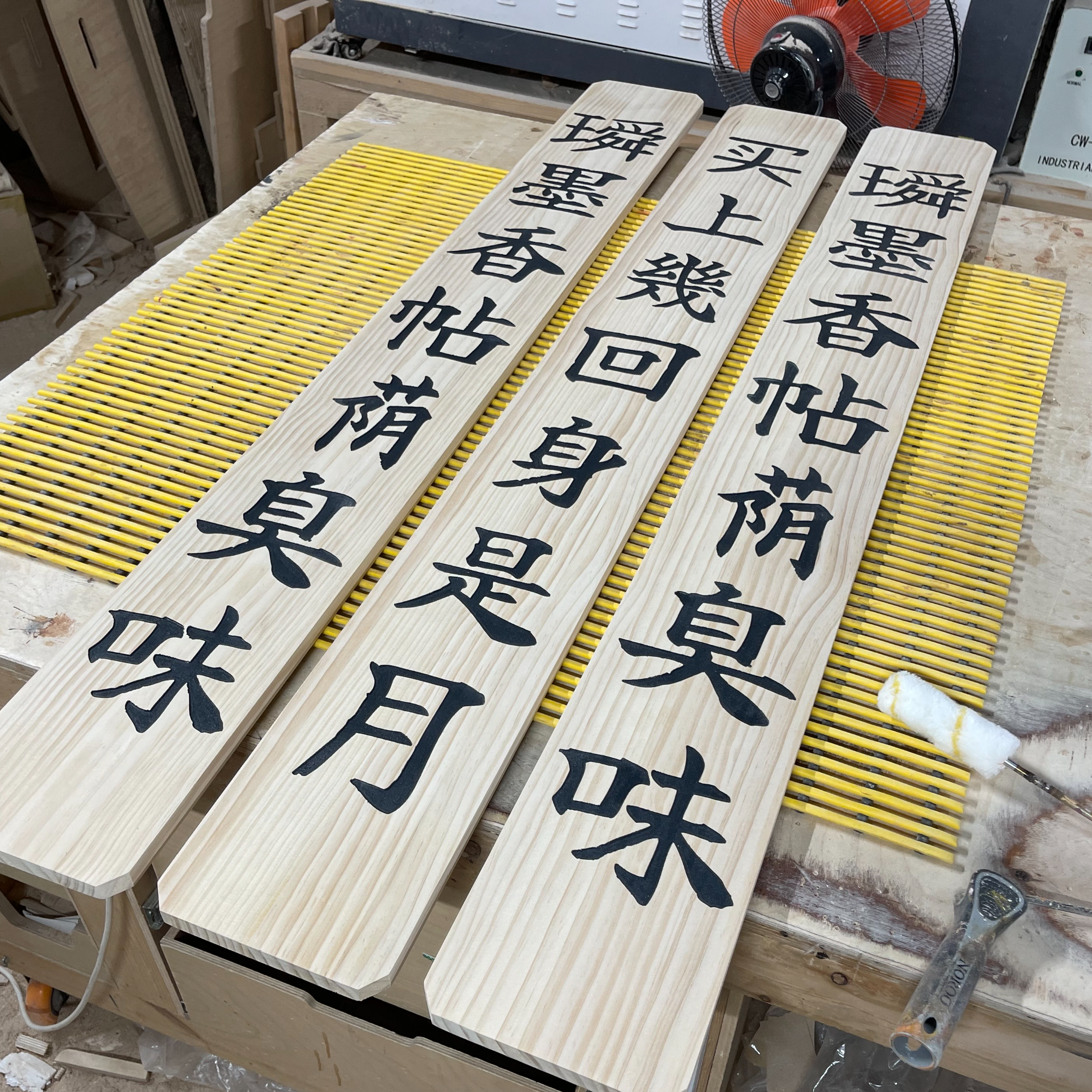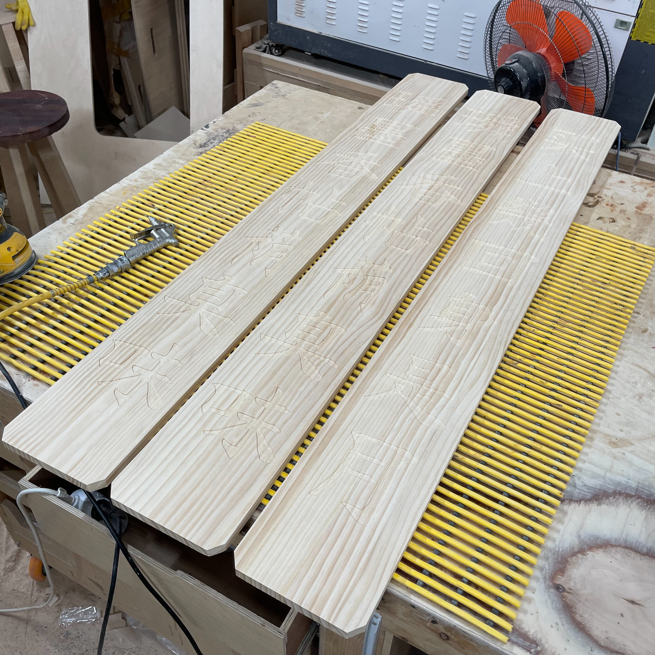 세 개의 멋있는 현판이 작업대에 올라왔습니다.
