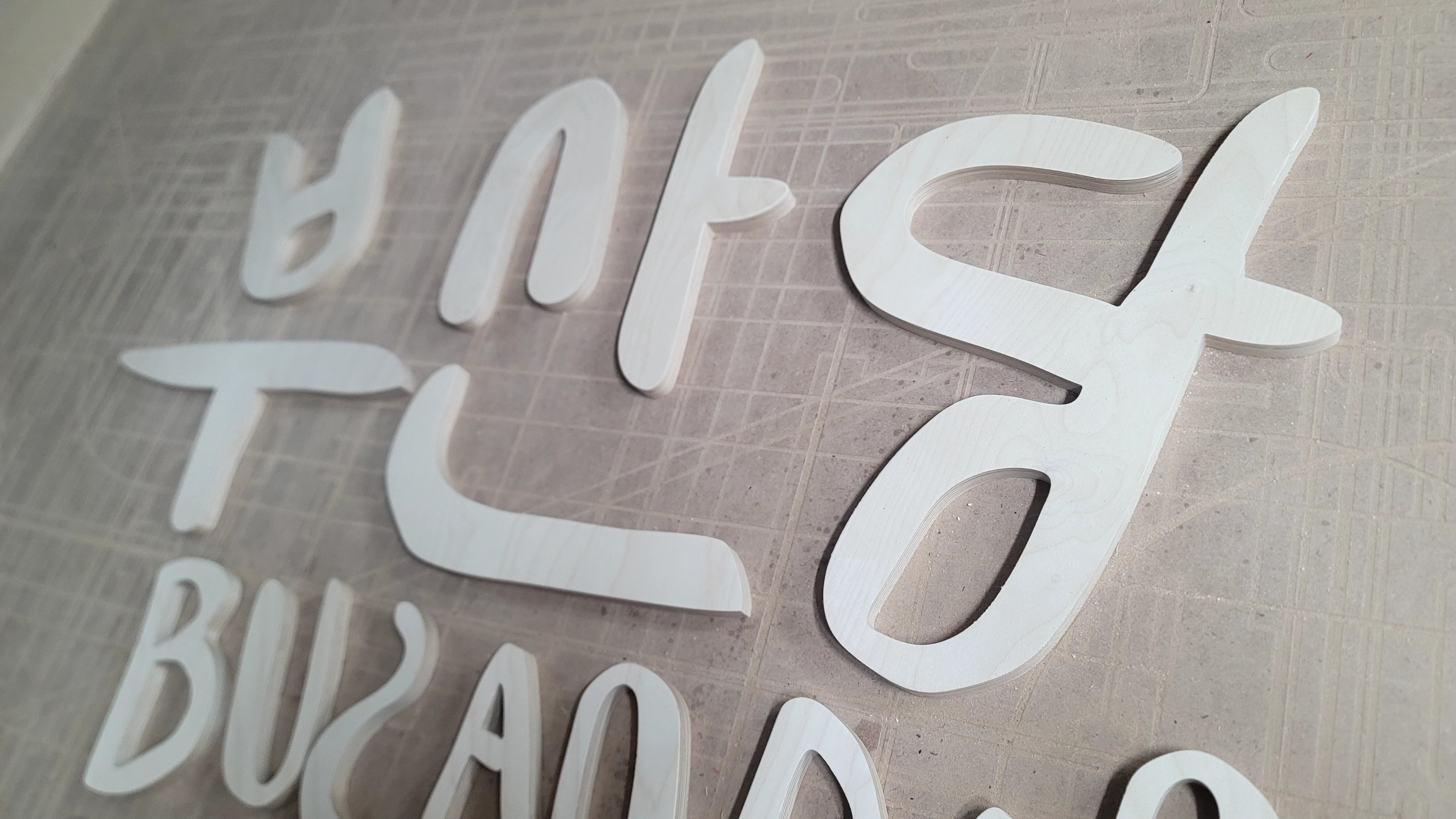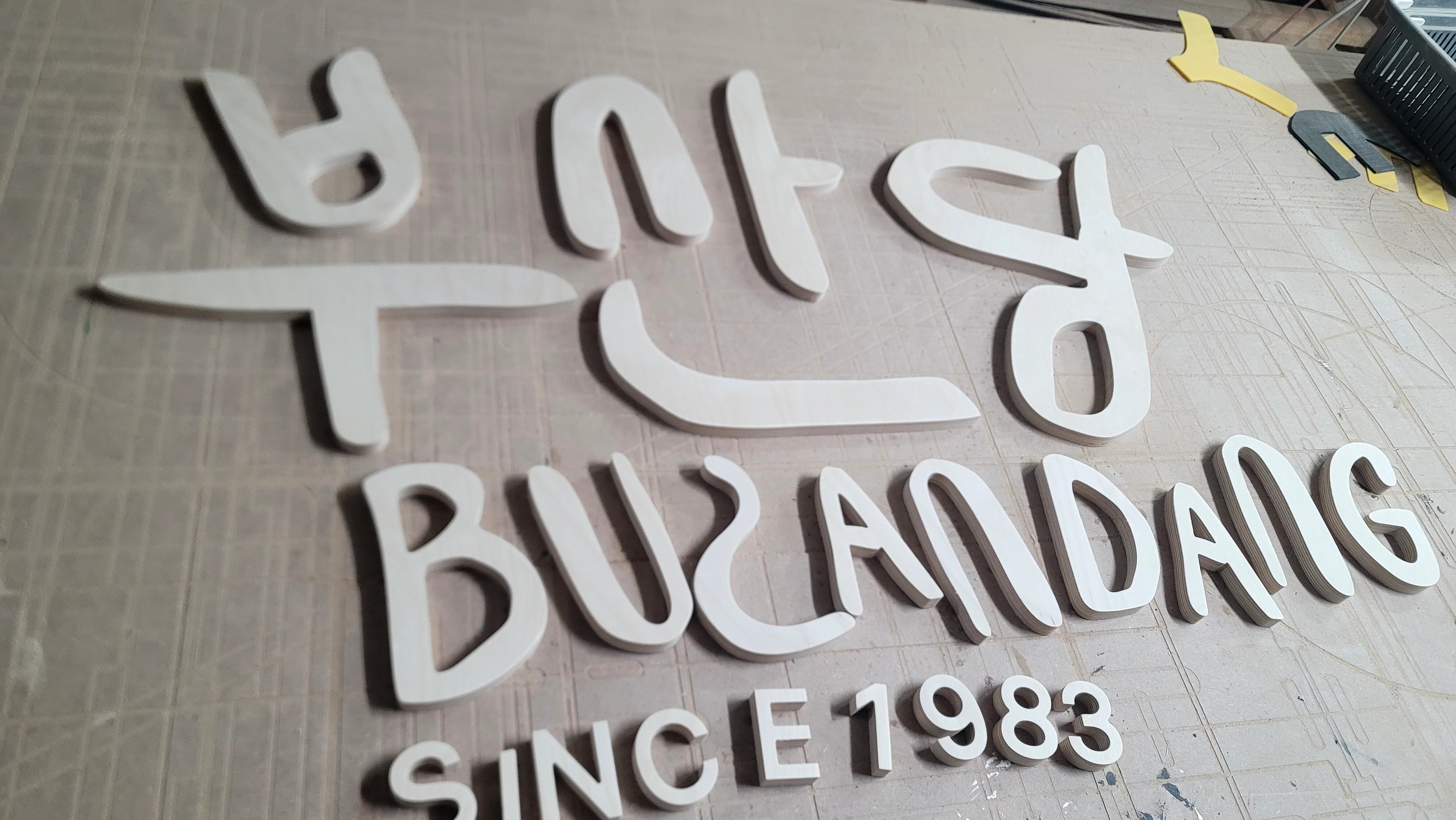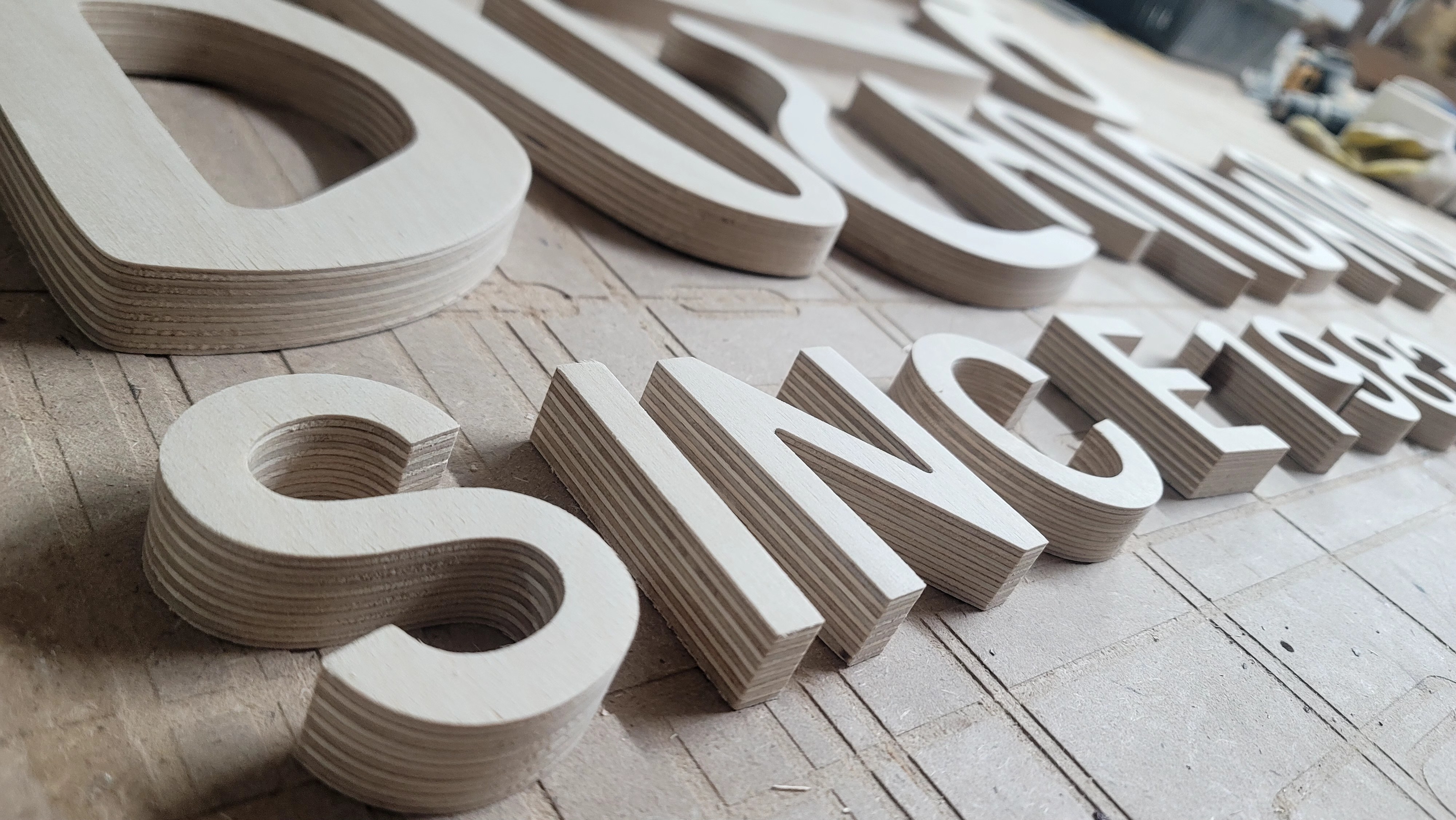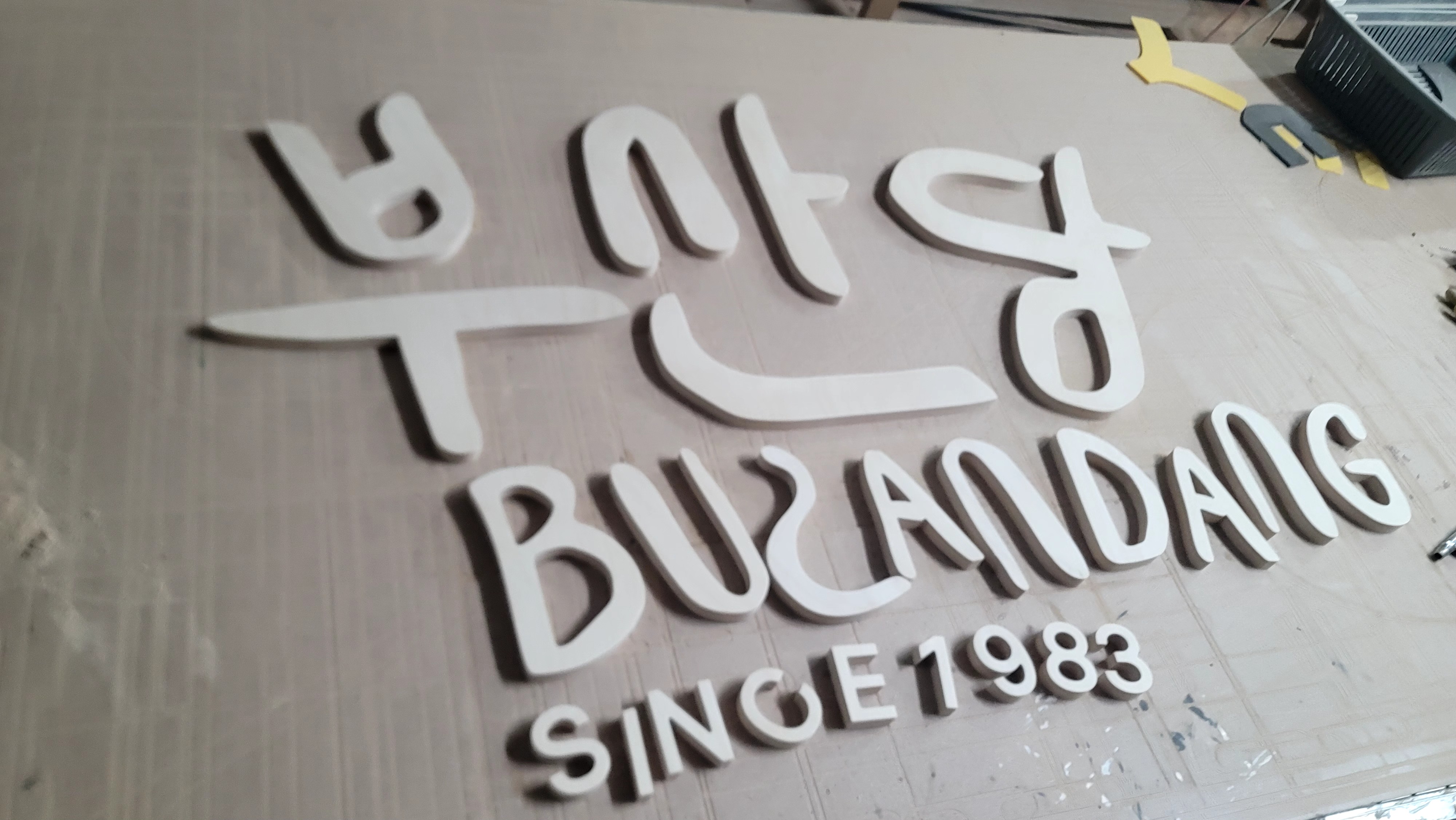 합판에서 문자를 오려내어서 입체감을 주는 제작 방식을 뜻합니다!
