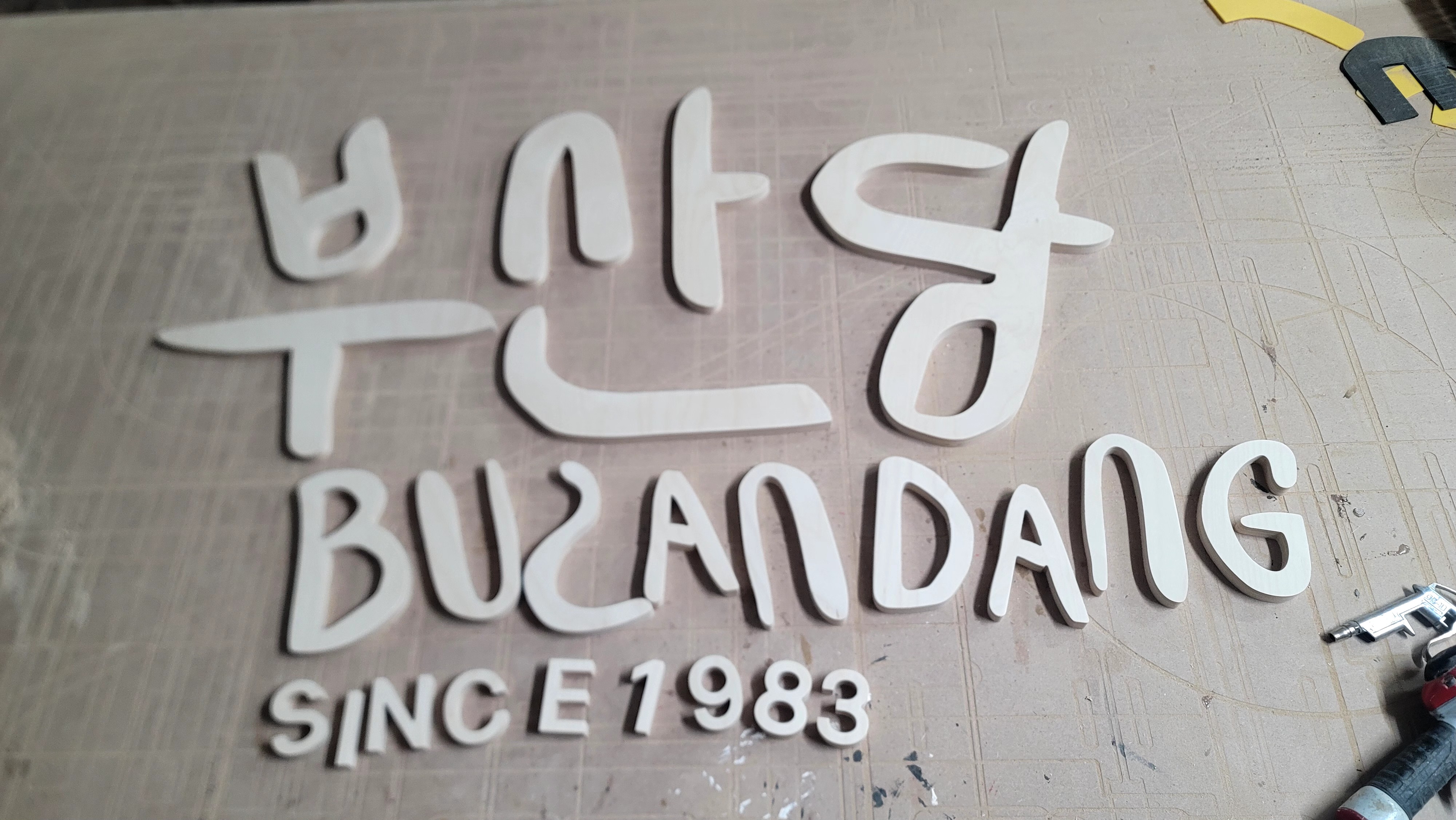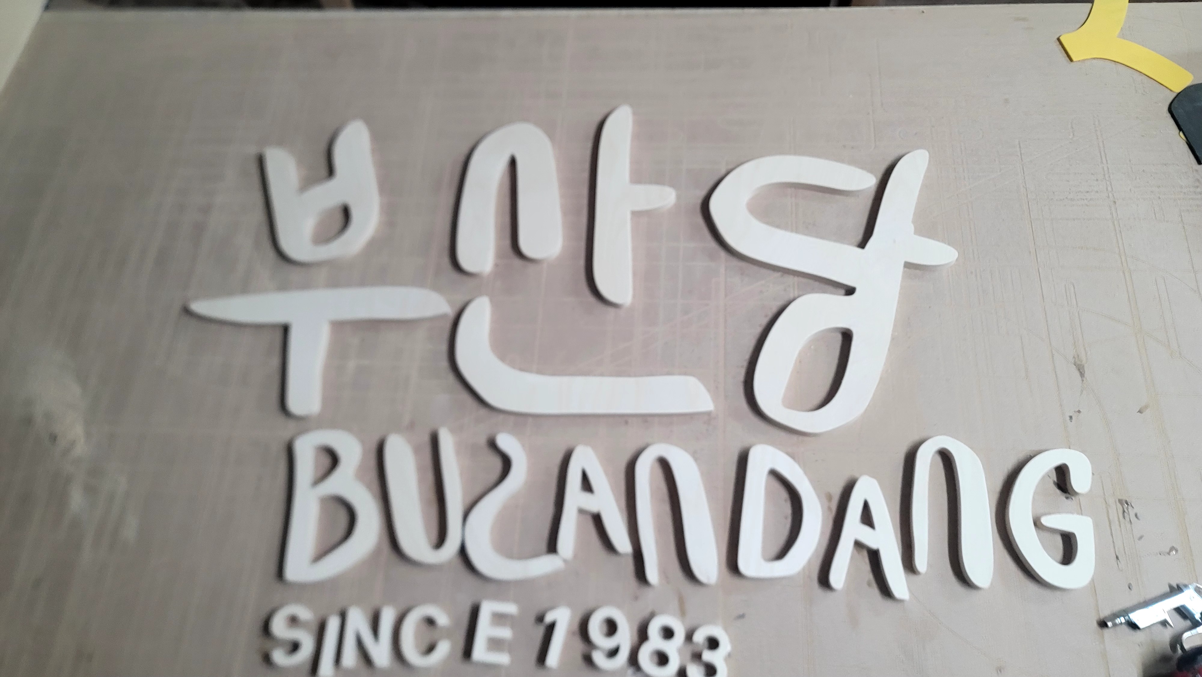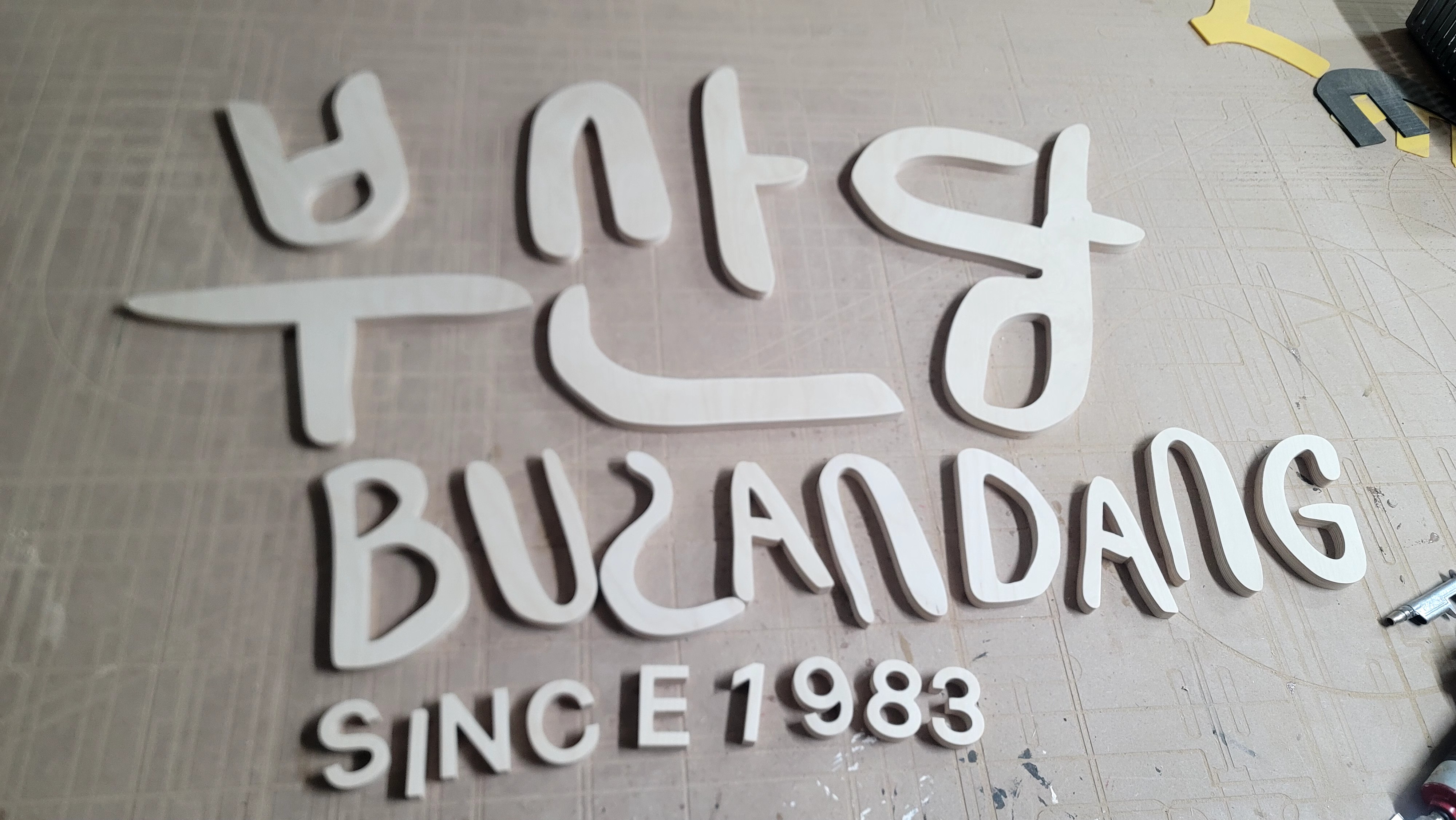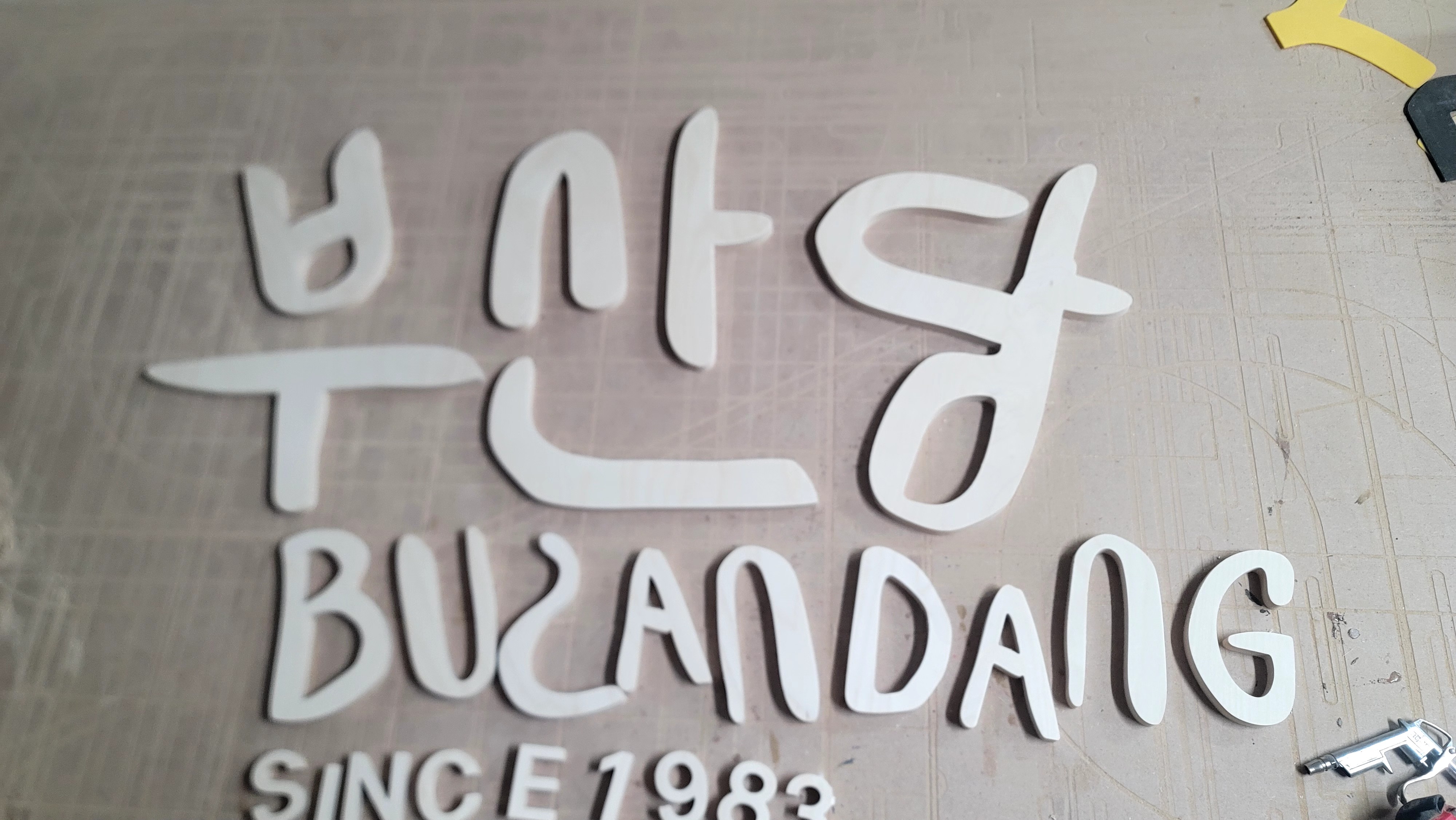합판에서 문자를 오려내어서 입체감을 주는 제작 방식을 뜻합니다!