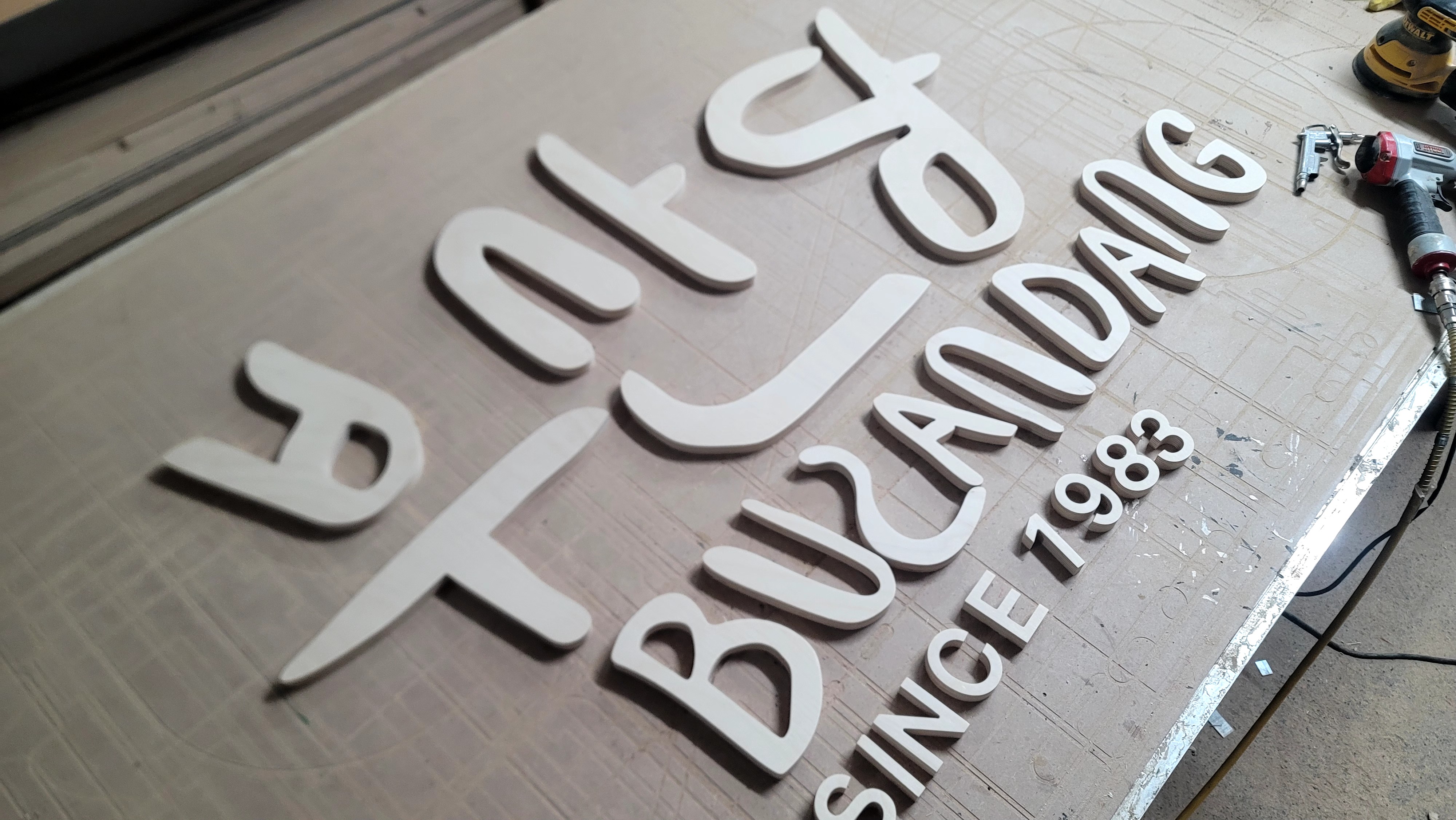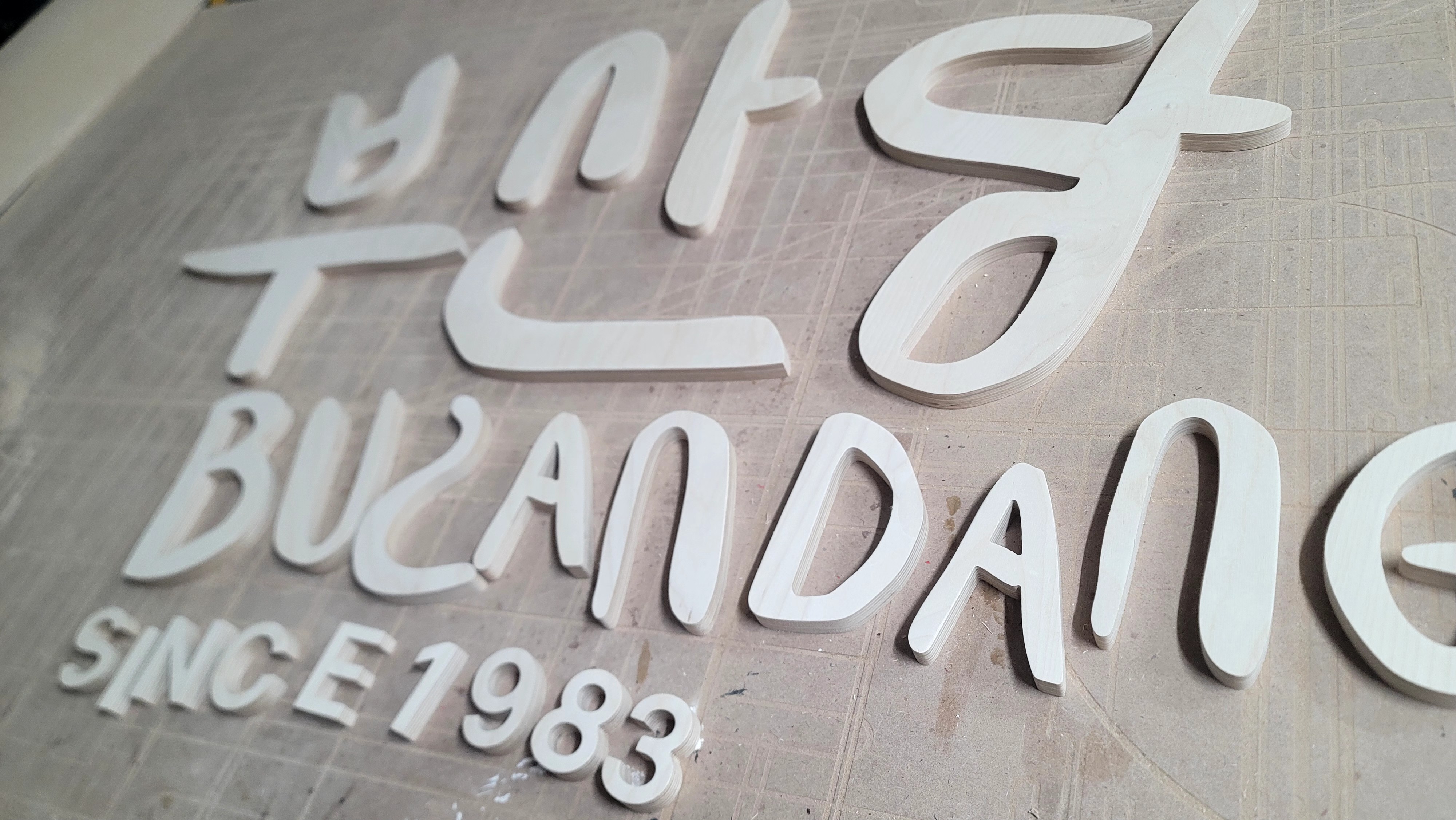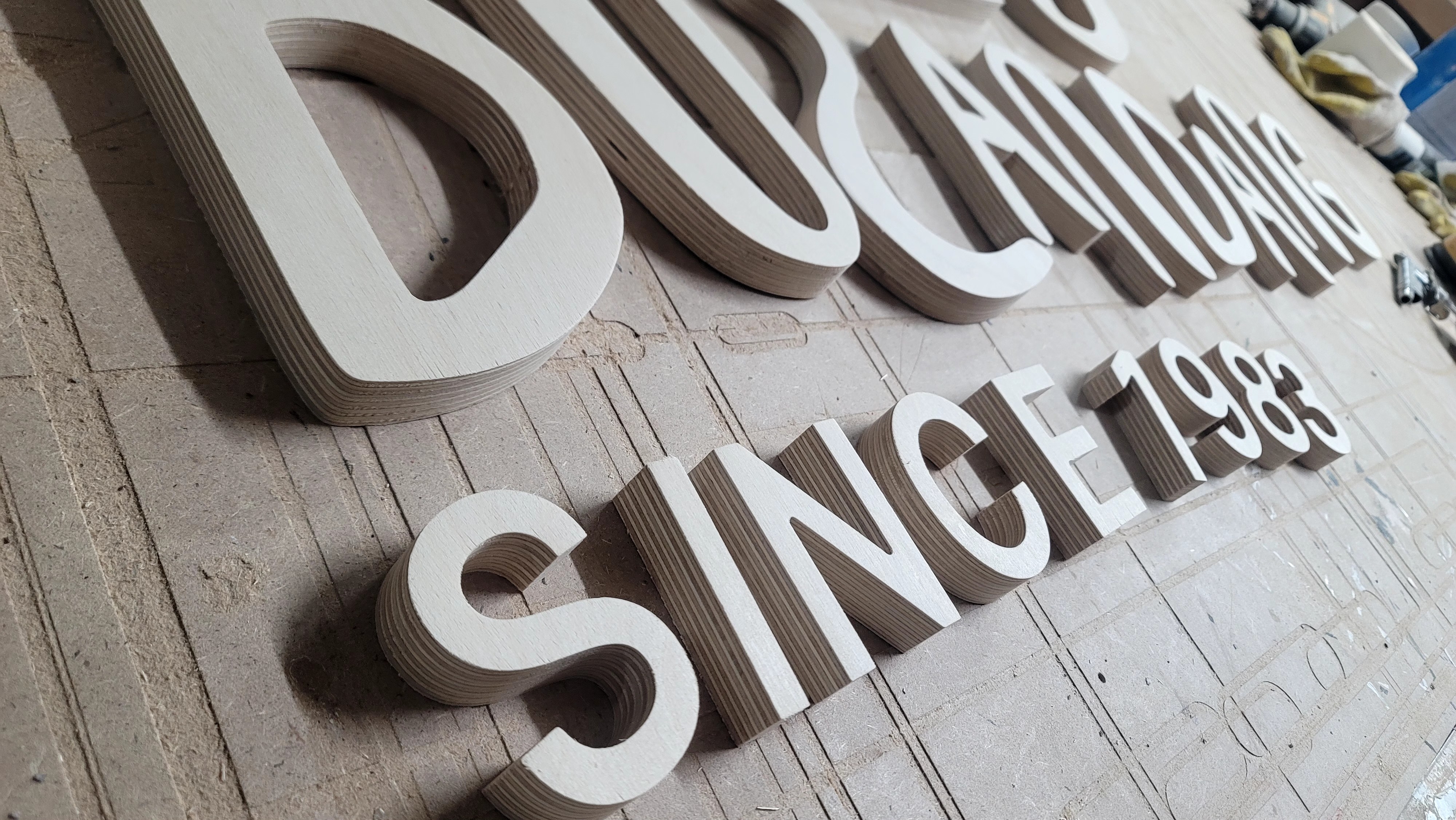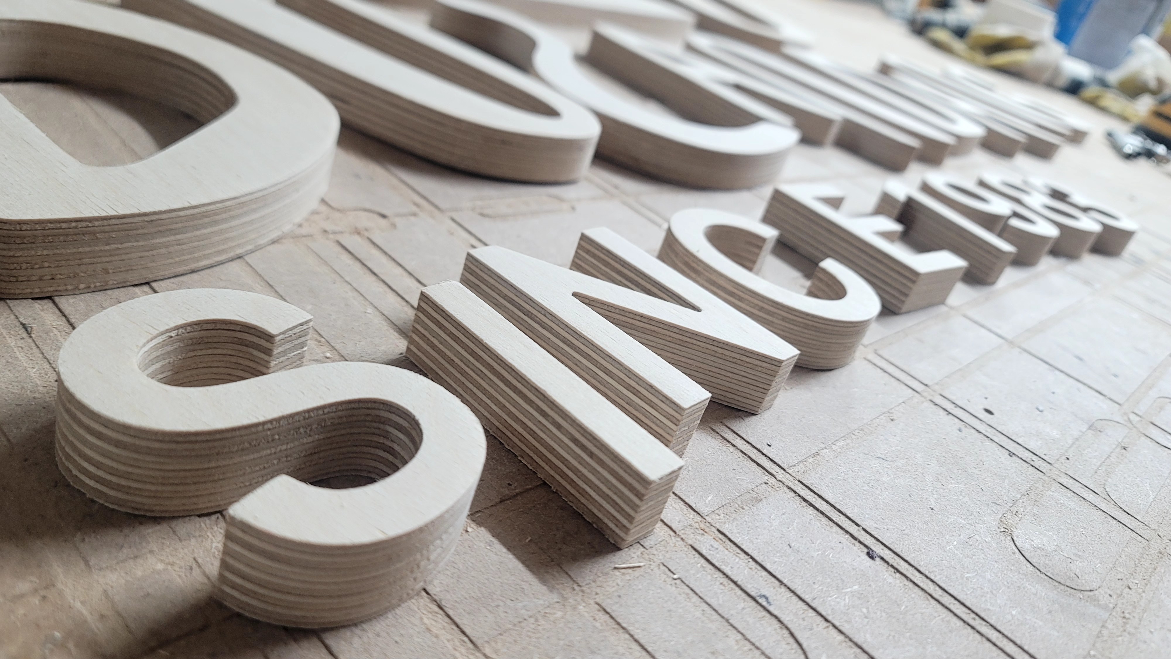 합판에서 문자를 오려내어서 입체감을 주는 제작 방식을 뜻합니다!